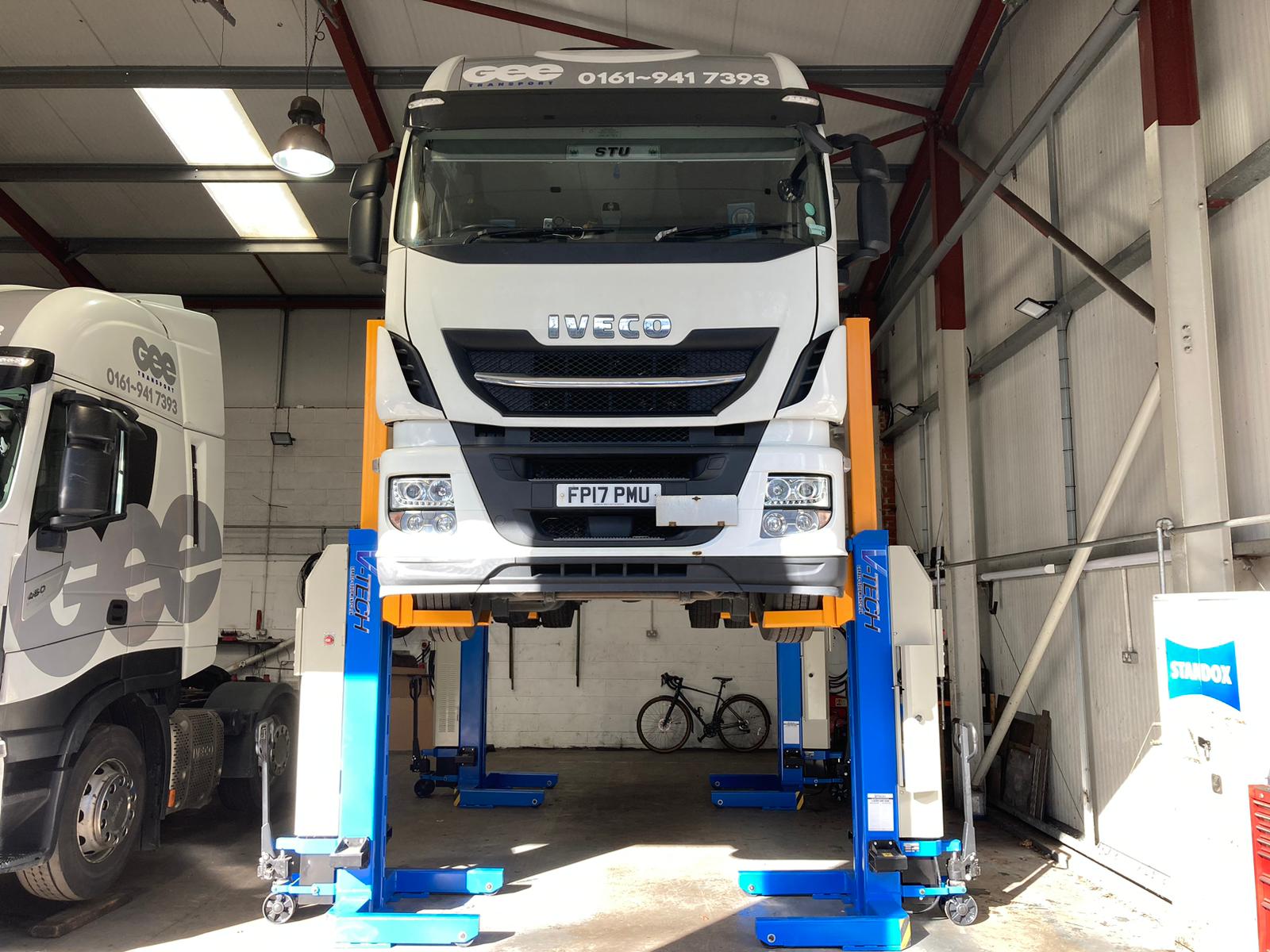 V-TECH SUPPLIES WIRELESS COMMERCIAL MOBILE COLUMN LIFTS FOR GEE TRANSPORT IN ALTRINCHAM!